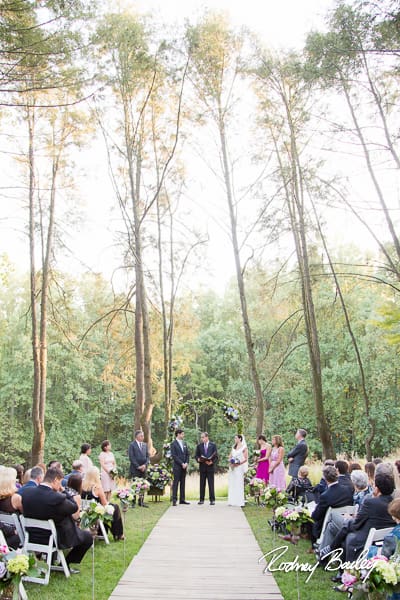 Huge shade trees of every kind fill the backdrop. Natural light floods in between the branches, creating ethereal photos and enhancing the magic of your big day. Guests can sit comfortably in chairs out on the lush green lawn as you walk down the aisle to meet your other half under the wedding arch. What a spectacular view!